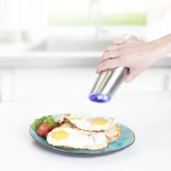 Deze Bestron peper en zout molen heeft een stijlvol Rvs-design, is 20 cm hoog en is eenvoudig te bedienen met één hand. Hij is namelijk elektrisch, dus met een druk op de knop heb je heerlijk versgemalen peper en zout. Deze molen heeft nog een leuk extraatje: hij stopt automatisch met malen als je hem kantelt. Dat is pas een knap staaltje zwaartekracht! Wil je andere kruiden toevoegen zoals Italiaanse kruiden of knoflook? Dat kan ook! Gebruik de kruiden die je wilt en stop ze in het transparante acryl reservoir. Stel de vermaling van jouw kruiden bovendien in van zeer fijn tot grof: net wat je nodig hebt.