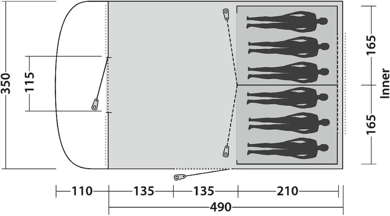 Je loopt deze tent heel eenvoudig binnen door de grote D-vormige deur óf de zijdeur. Je kunt daarnaast de tunneltent naar eigen wens indelen. Vind je het gezellig om met zijn allen in één ruimte te slapen? Of wil je juist liever twee gescheiden slaapplekken? Het is beide mogelijk, dankzij de scheidingswand in de tent.